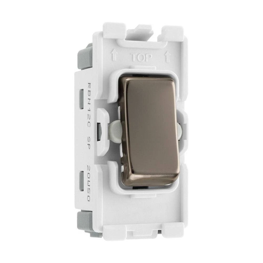 The BG Electrical RBN12C is a 20 Amp, 2 Way Single Pole grid module with a black nickel rocker. Compatible with the BG Nexus Metal, and BG Screwless grid range, grid modules enable you to customise your own switch, by combining three elements, grid plate, grid frame and grid module.