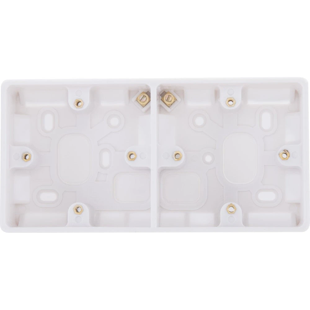 This 37mm surface mounted dual pattress from BG’s Nexus white moulded 800 series is ideal for installation where 2 single electrical outlets are required without the need to remove material from the wall. It has soft, rounded edges matching the rest of the range, has multiple knockouts for versatility and comes with an earth terminal.