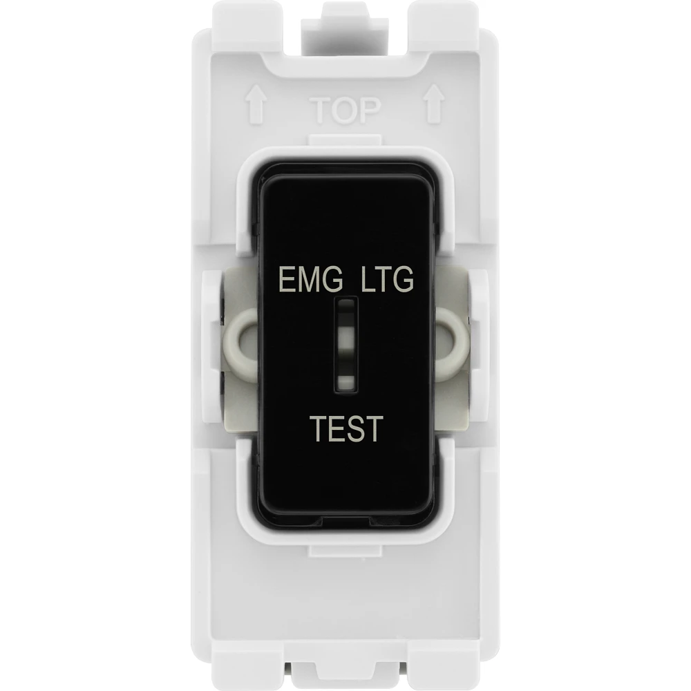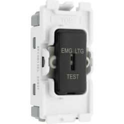 The BG Electrical RPCDB12EL is a 20 Amp, 2 Way key grid module with a black front and marked with ‘EMG LGT TEST’ . Compatible with the BG Evolve grid range, grid modules enable you to customise your own switch, by combining three elements, grid plate, grid frame and grid module.