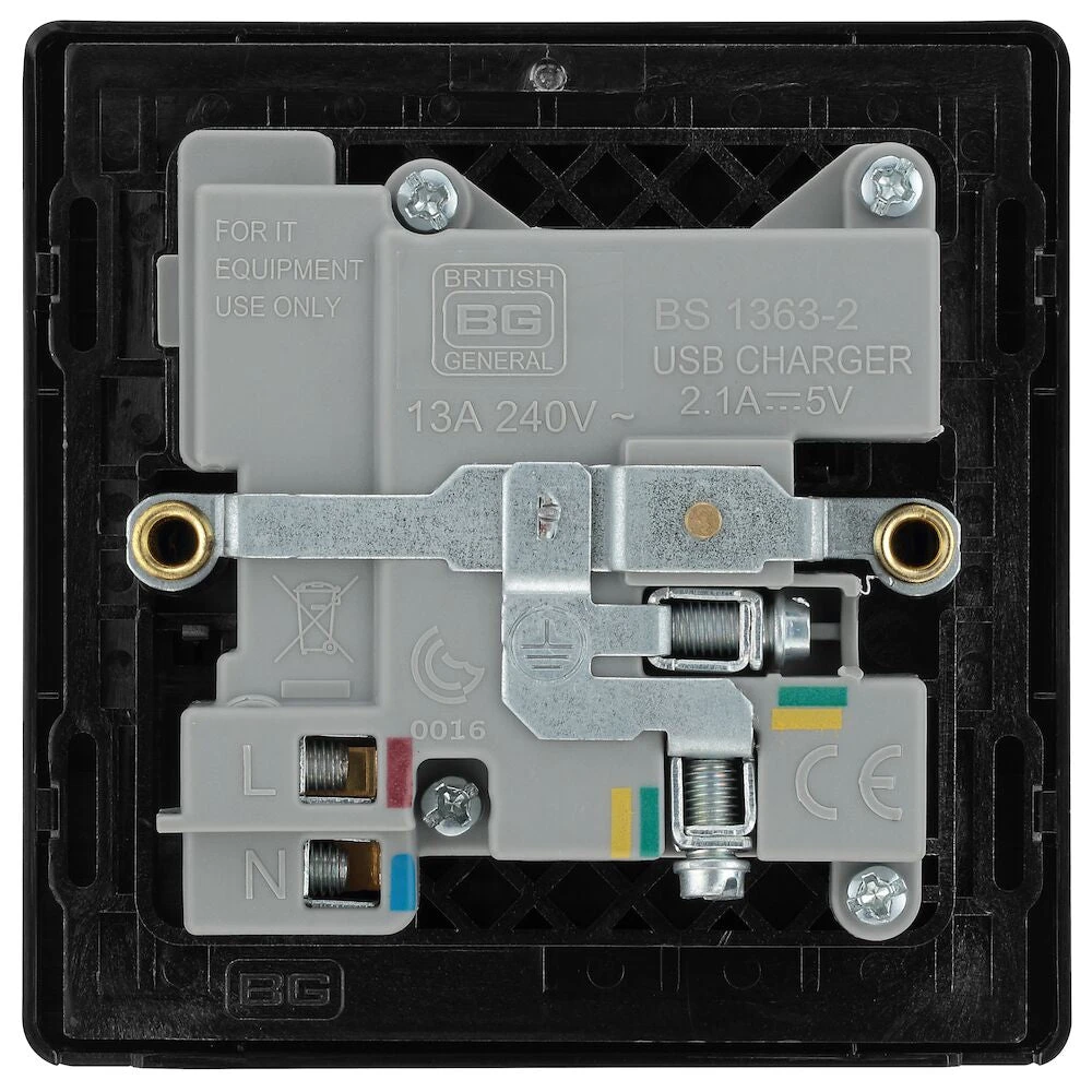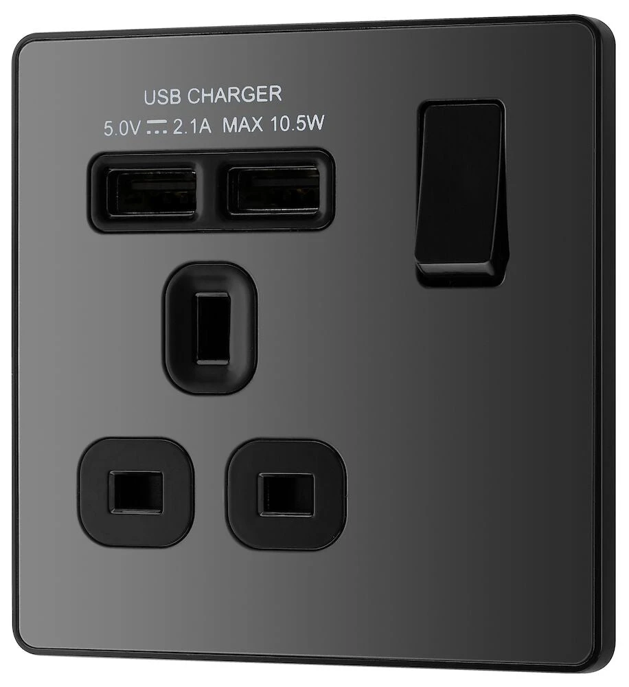 The PCDBC21U2B is a 13A single USB socket from the BG Evolve range, finished in black chrome. The BG Evolve range is new on the outside with its polycarbonate front plates but has the same trusted internal technology found in the Nexus Metal range. The Evolve range gives you the ease and flexibility to remove and change the front plates, allowing on-trend finishes without losing the level of quality and reliability.