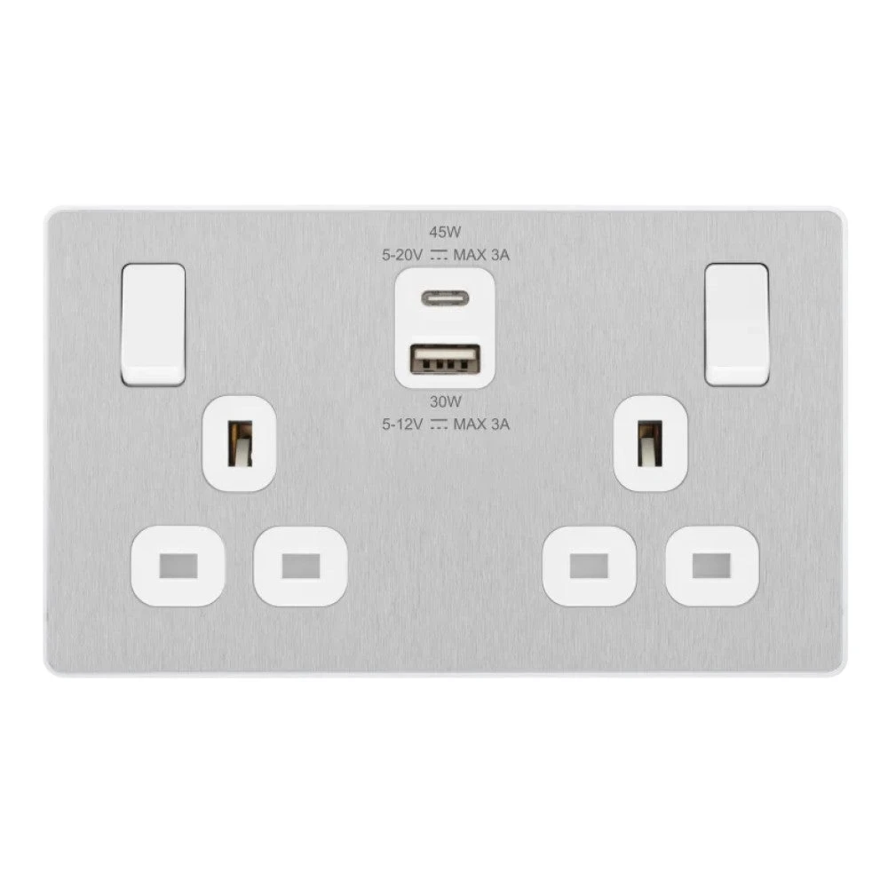 BG Evolve Brushed Steel 13A Double USB Socket With 45W A+C Ports PCDBS22UAC45W