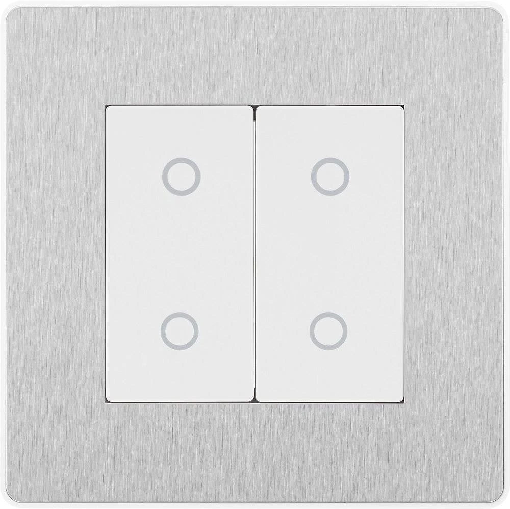 The PCDBSTDS2W is a 2G secondary touch dimmer switch from the BG Evolve range, finished in brushed steel. The BG Brushed Steel Evolve range is new on the outside with its polycarbonate front plate and contrast white frame, but has the same trusted internal technology as the BG Nexus Metal range.