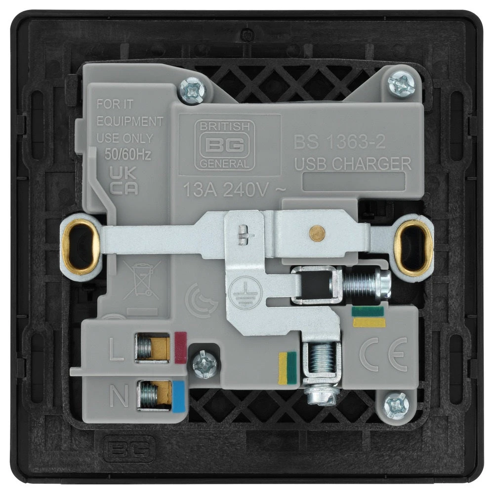 The PCDMB21UAC18B is a 13A single USB socket with two USB ports, A and C. The BG Evolve range is new on the outside with its polycarbonate front plates and contrasting frame, but has the same internal technology as the BG Nexus Metal range. With interchangeable front plates, the Evolve range allows you to move with the trends without losing the level of quality and reliability.