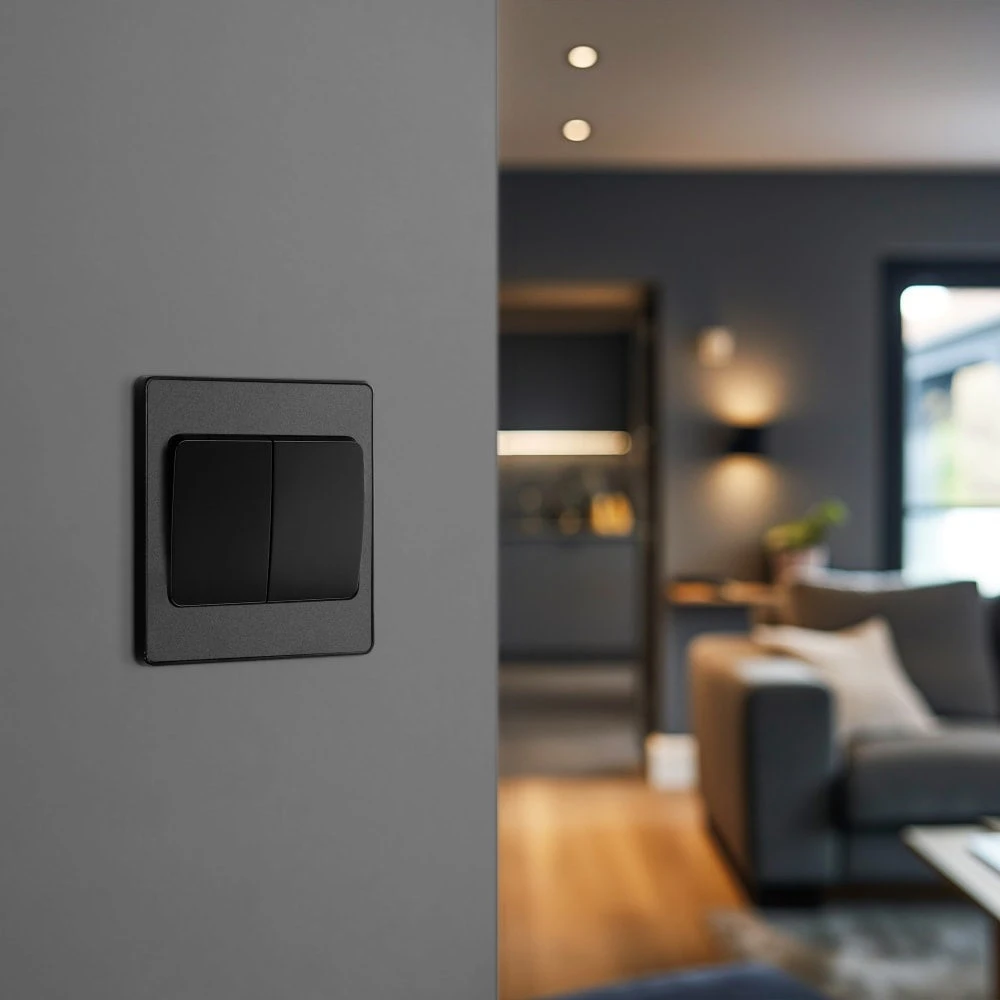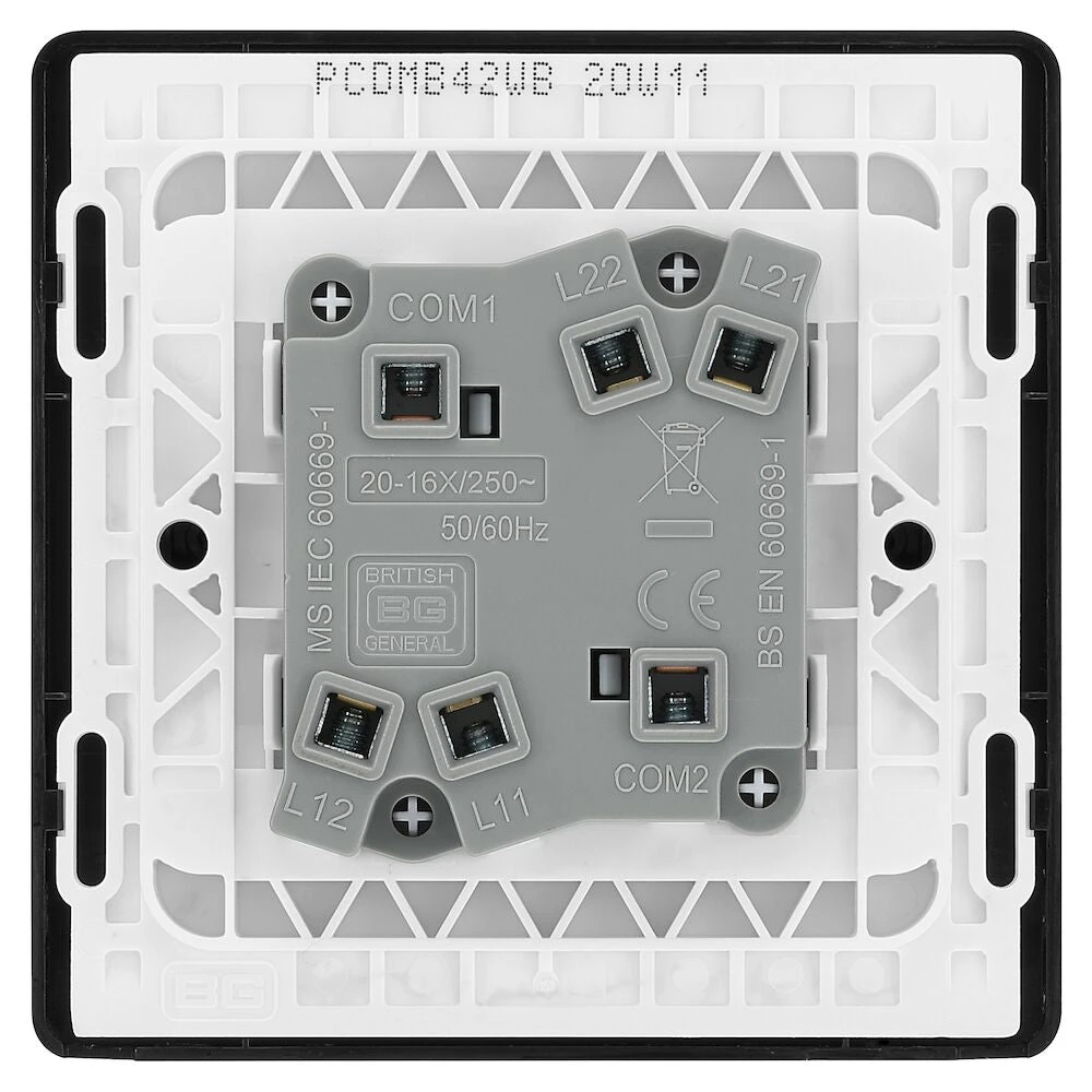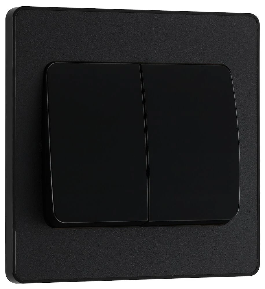 The PCDMB42WB is a 2G 2W wide rocker light switch from the BG Evolve range, finished in matt black. The BG Evolve range is new on the outside with its polycarbonate front plates and contrasting frame, but has the same internal technology as the BG Nexus Metal range. With interchangeable front plates, the Evolve range allows you to move with the trends without losing the level of quality and reliability.