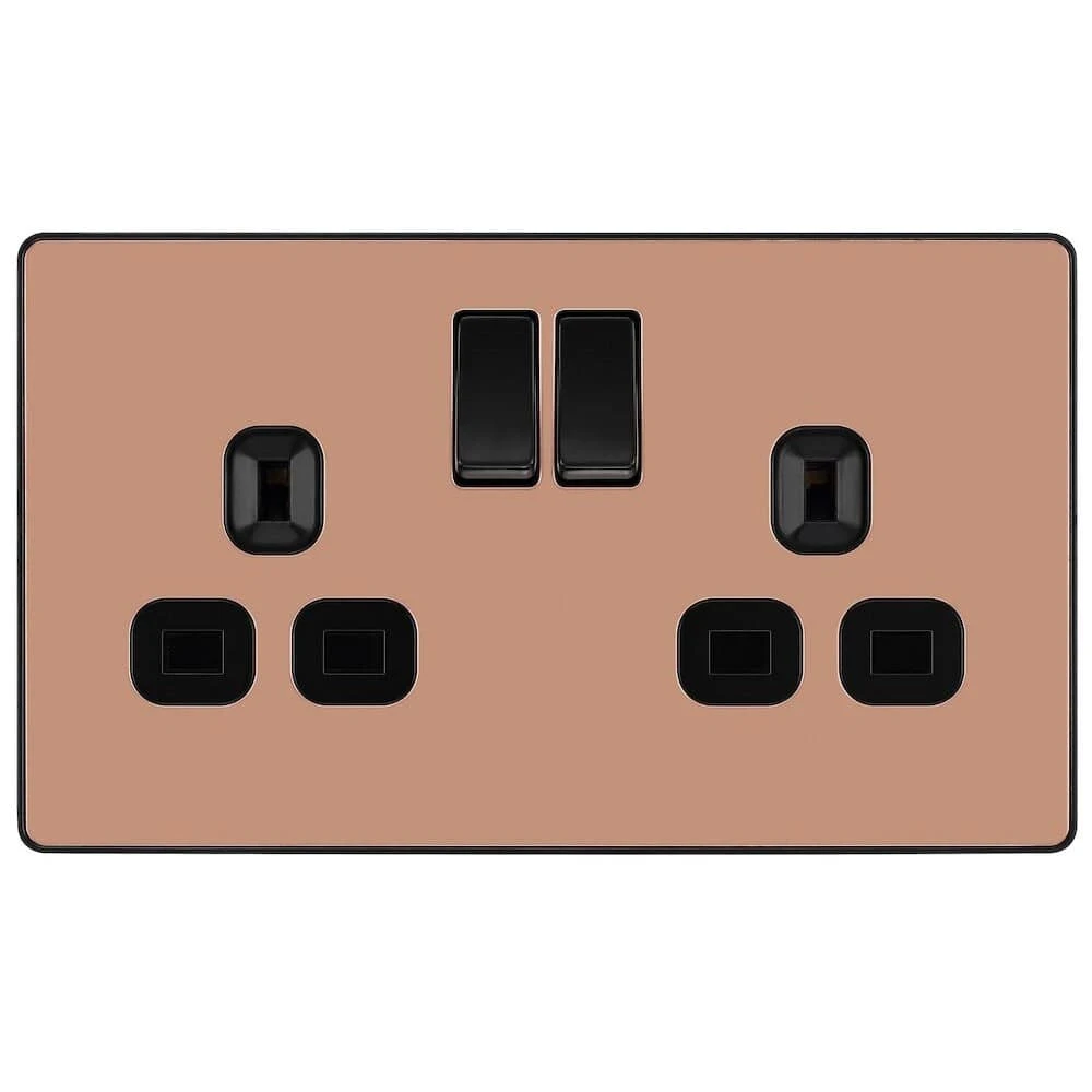The PCDCP22B is a double electrical socket from the BG Evolve range, finished in polished copper. The newest decorative collection from BG, the Evolve range is constructed from a lightweight, polycarbonate material, with a slim profile and a contrast edging.