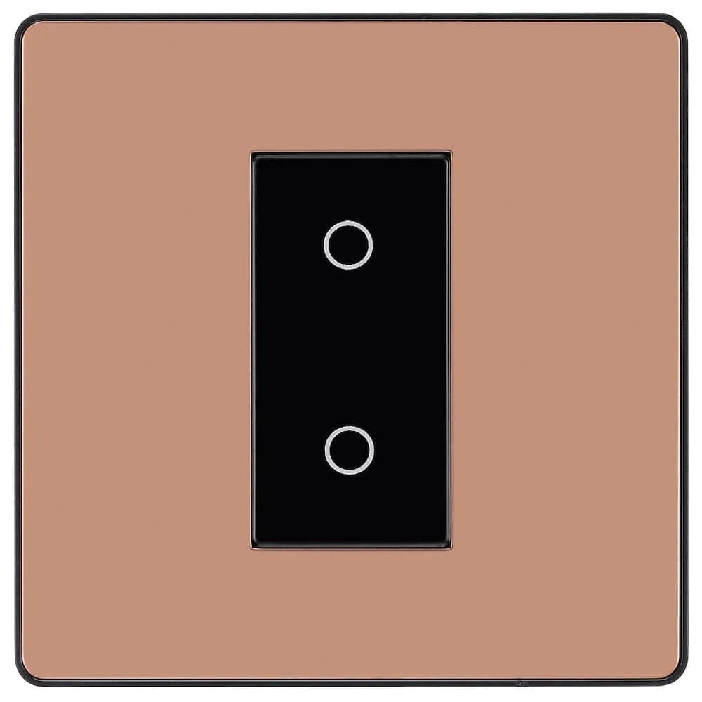 The PCDCPTDM1B is a 1G master touch dimmer switch from the BG Evolve range, finished in polished copper. The newest decorative collection from BG, the Evolve range is constructed from a lightweight, polycarbonate material, with a slim profile and a contrast edging.
