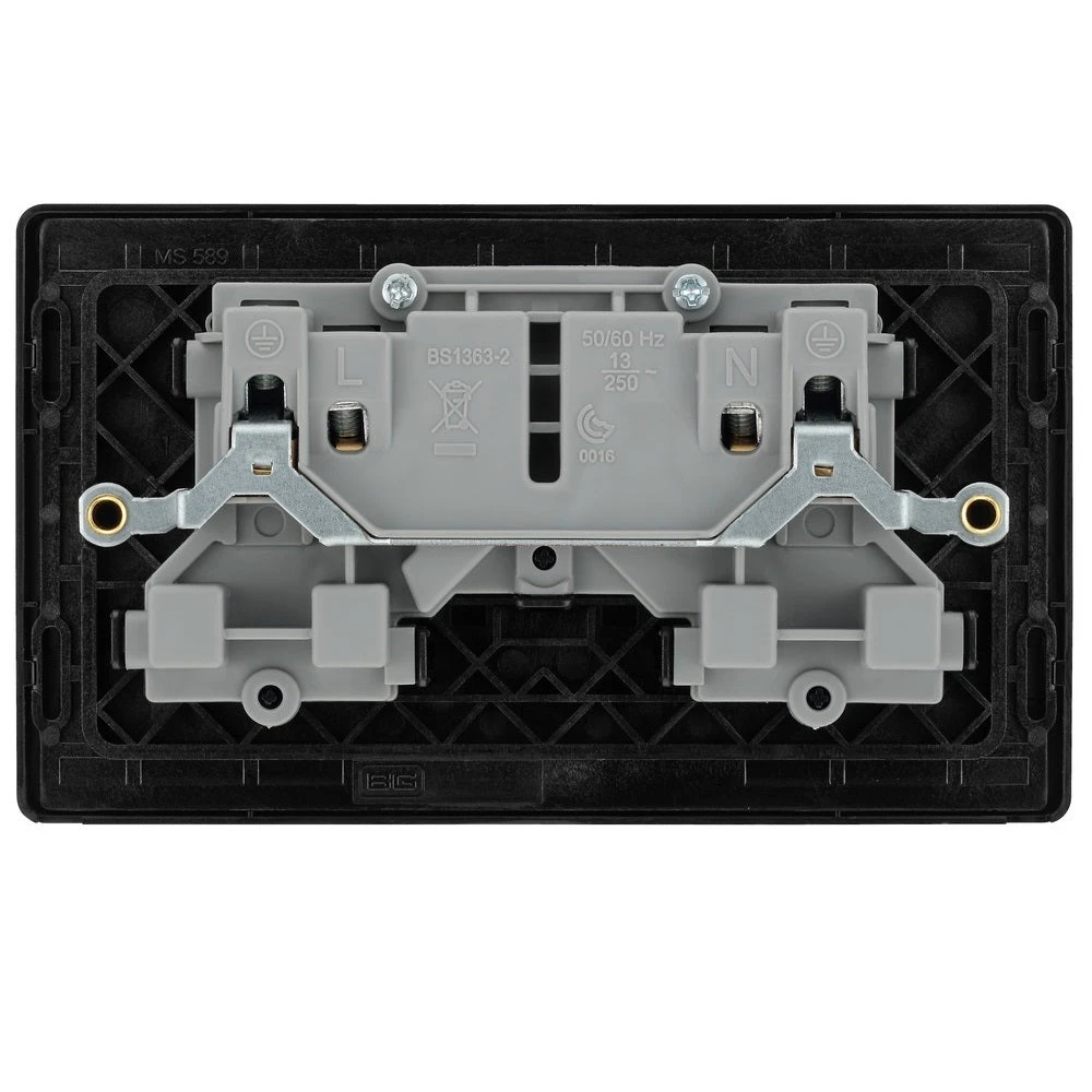 The PCDSB22B is a 13A double socket from the BG Evolve range, finished in satin brass. The BG Evolve range is new on the outside with a polycarbonate front plate and contrast frame, but the inside is the same trusted technology as the BG Nexus Metal range. The satin brass finish comes with contrast black frame and black inserts.