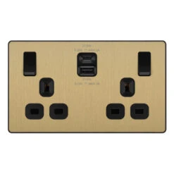 The PCDSB22UAC22B is a 13A double USB socket with 22W A+C ports from the BG Evolve range, finished in satin brass. The BG Evolve range is new on the outside with a polycarbonate front plate and contrast frame, but the inside is the same trusted technology as the BG Nexus Metal range. The satin brass finish comes with contrast black frame and black inserts.
