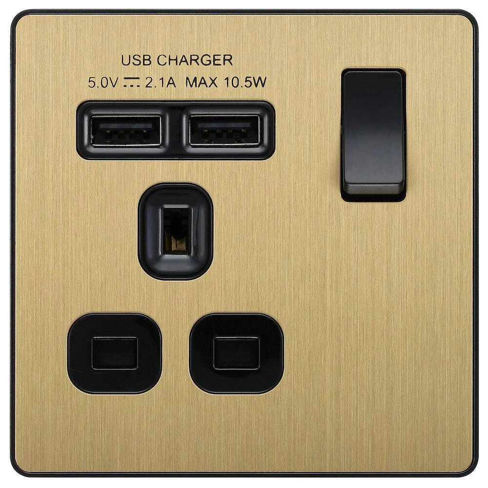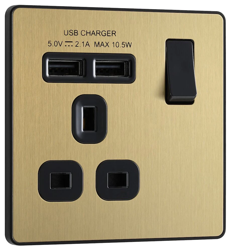 The PCDSB21U2B is a 13A single USB socket from the BG Evolve range, finished in satin brass. The BG Evolve range is new on the outside with a polycarbonate front plate and contrast frame, but the inside is the same trusted technology as the BG Nexus Metal range. The satin brass finish comes with contrast black frame and black inserts.