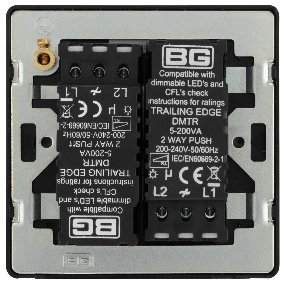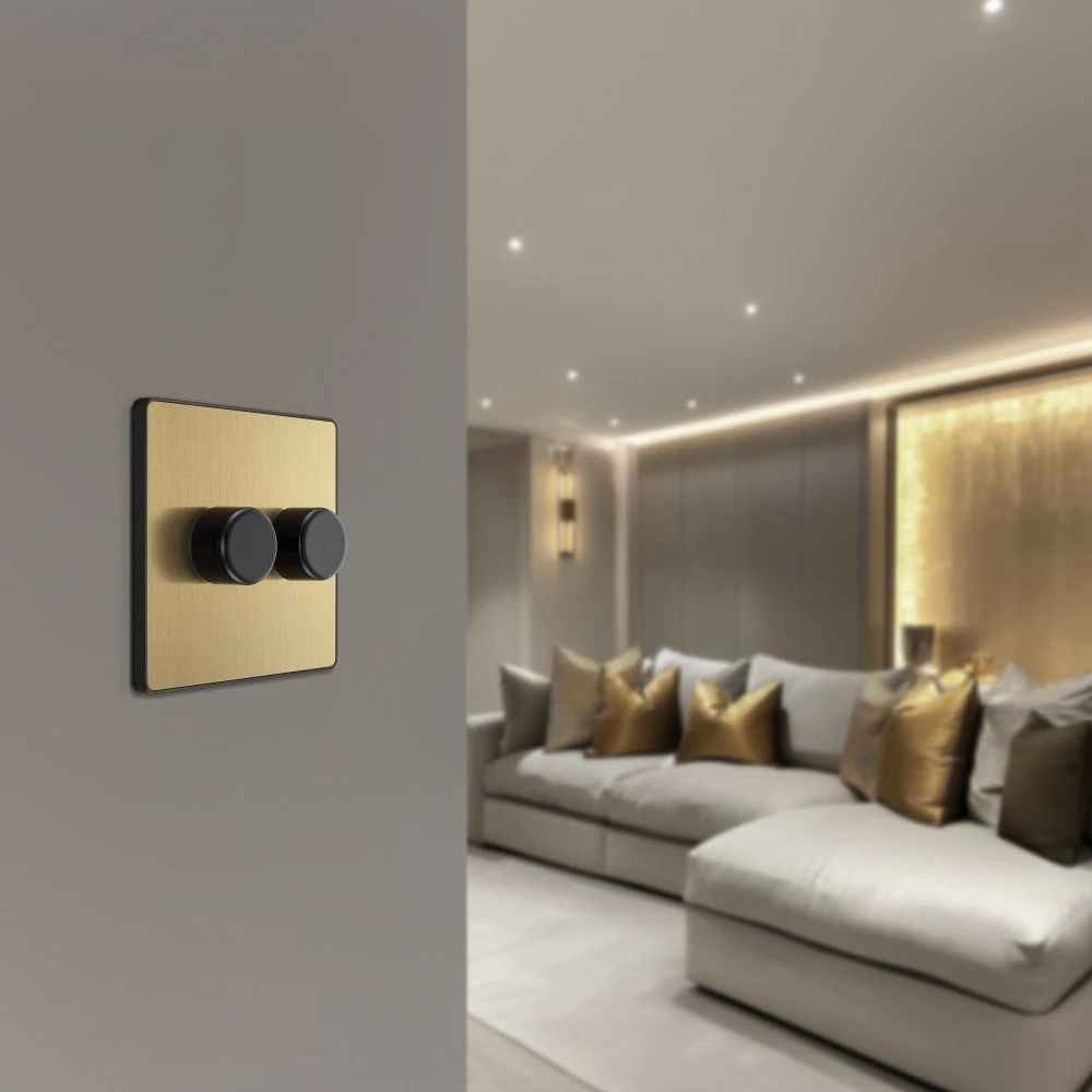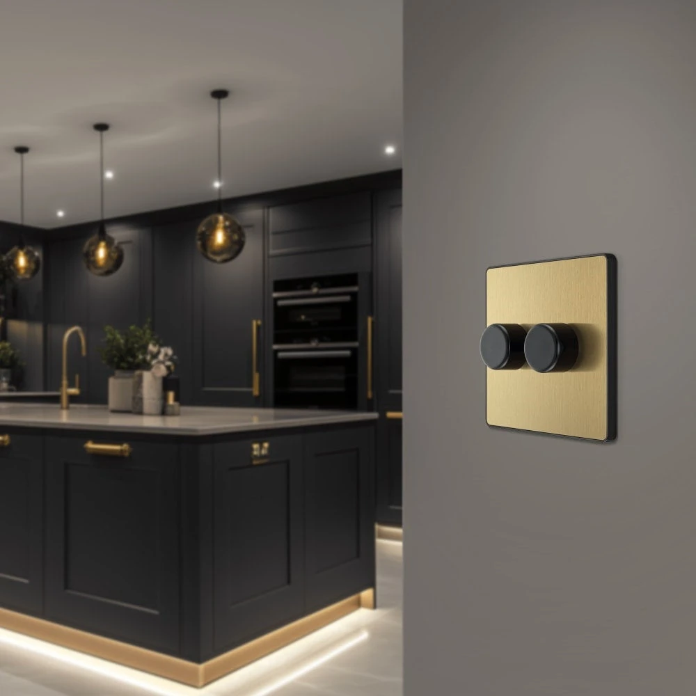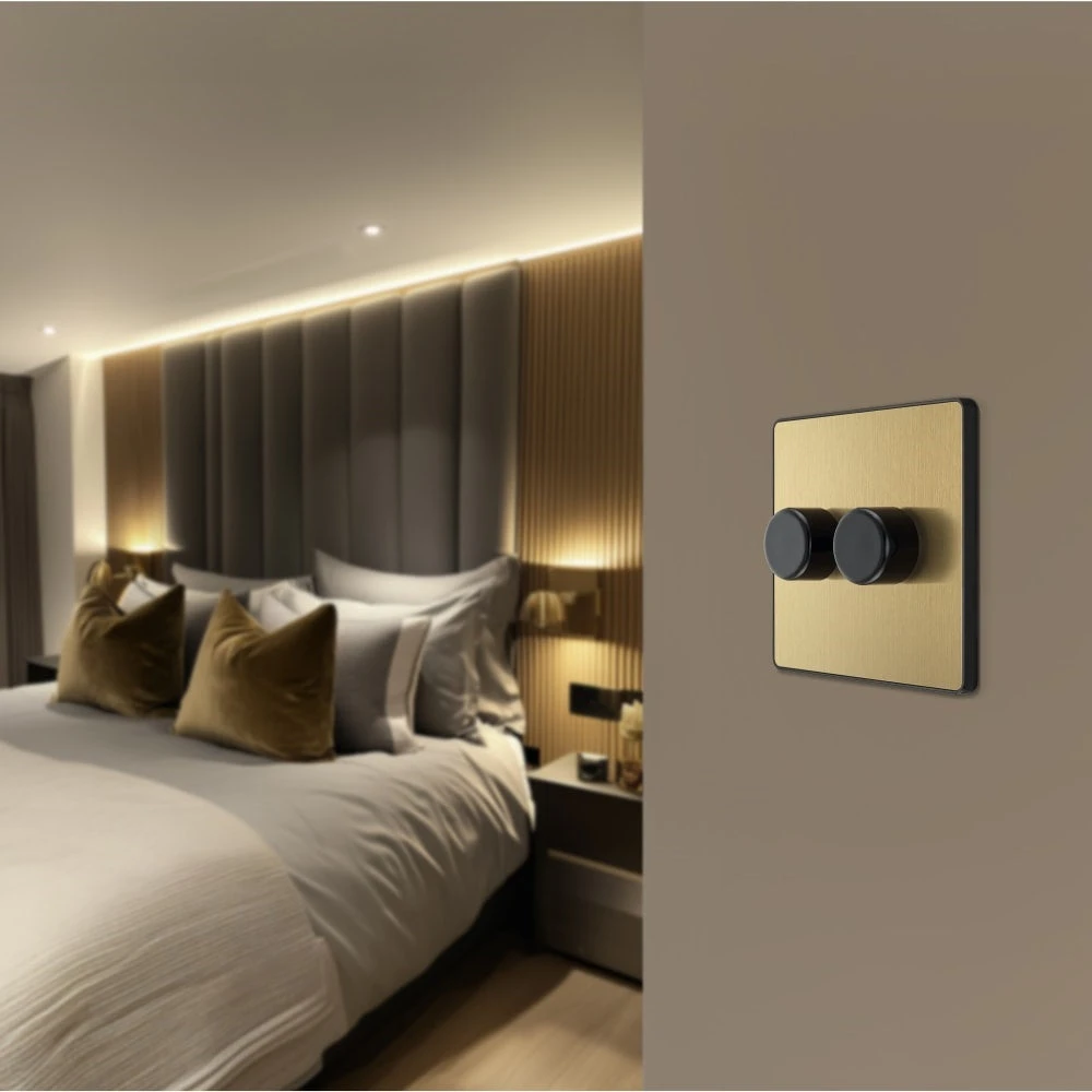 The PCDSB82B is a 2G dimmer switch from the BG Evolve range, finished in satin brass. The BG Evolve range is new on the outside with a polycarbonate front plate and contrast frame, but the inside is the same trusted technology as the BG Nexus Metal range. The satin brass finish comes with contrast black frame and black inserts.
