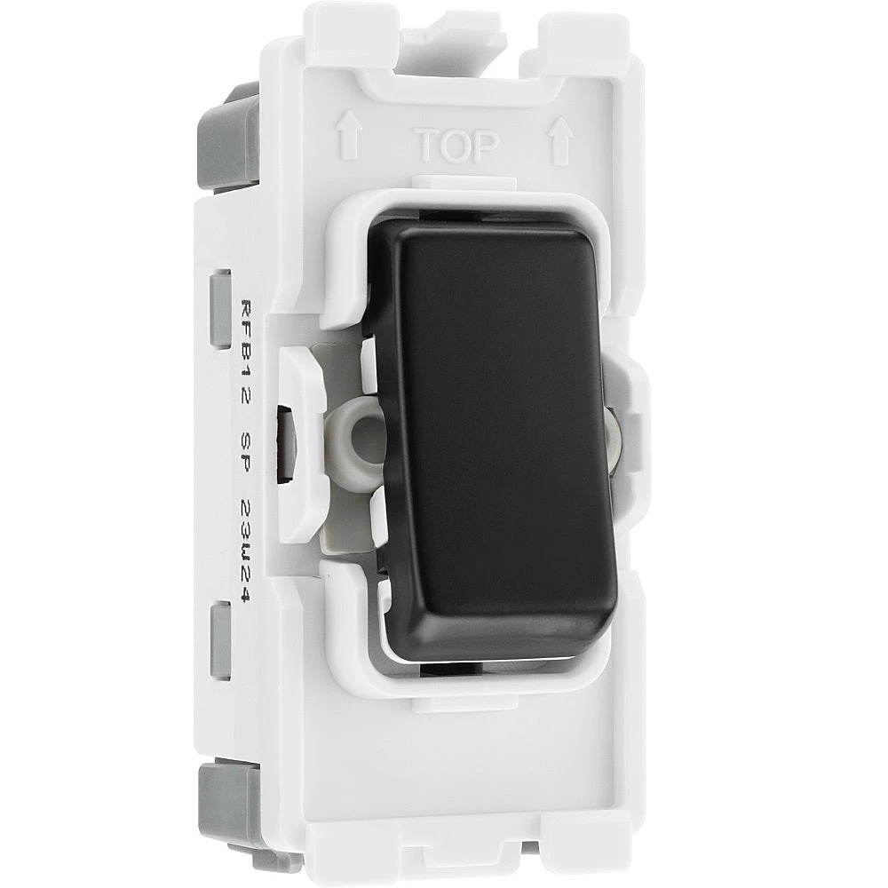 The RFB12 is a 20 Amp 2 way, Single Pole Key grid module with a matt black steel rocker compatible with the BG Nexus Metal and BG Screwless grid range. By using these grid modules it enables you to customise your own switch, by combining three elements, grid plate, grid frame and grid module.
