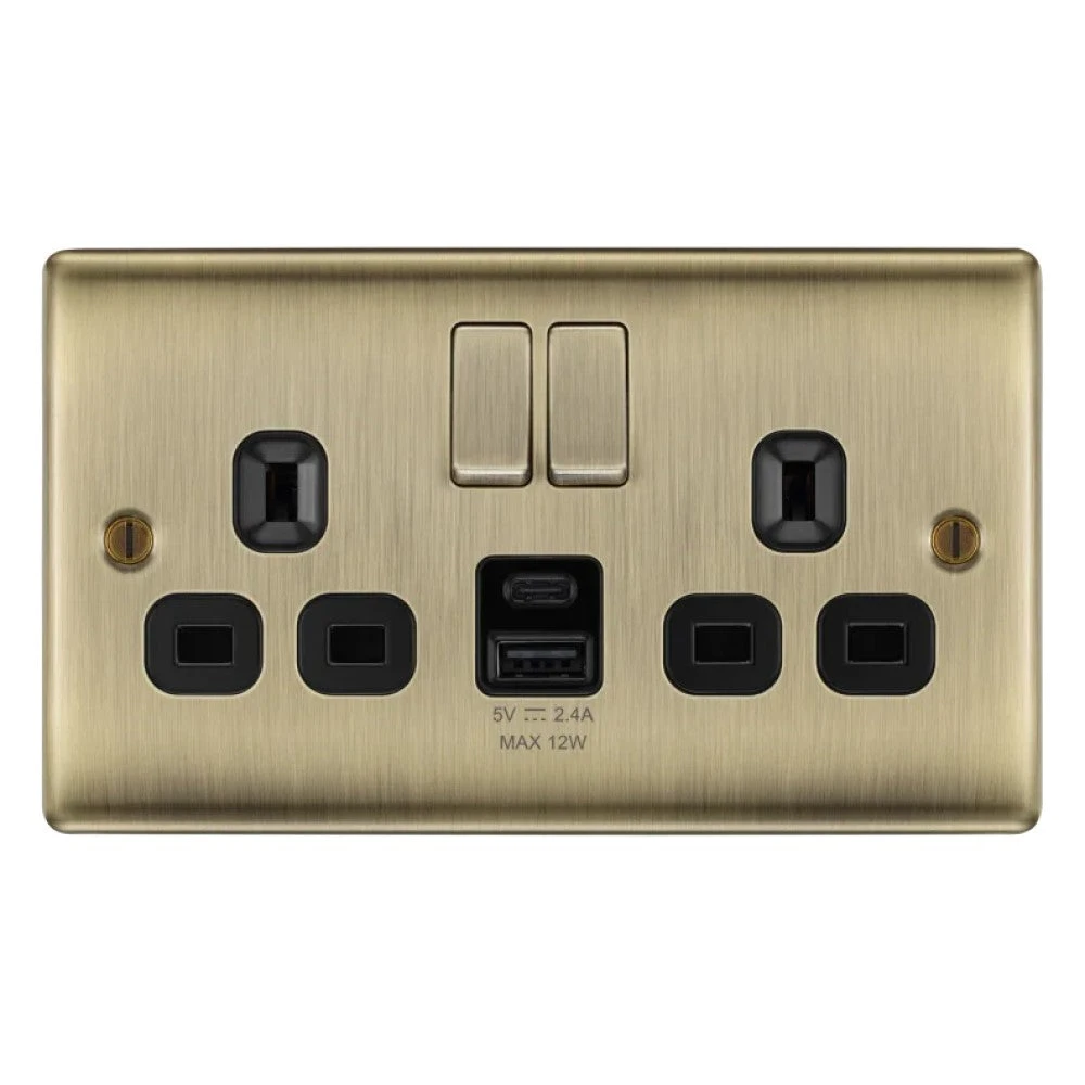 The NAB22UAC12B is a 13A double USB socket with A+C from the BG Nexus Metal range, finished in antique brass with black inserts. This range of switches and sockets has been designed with a modern, slim profile and has a lightly lacquered surface to reduce fingerprint marks.