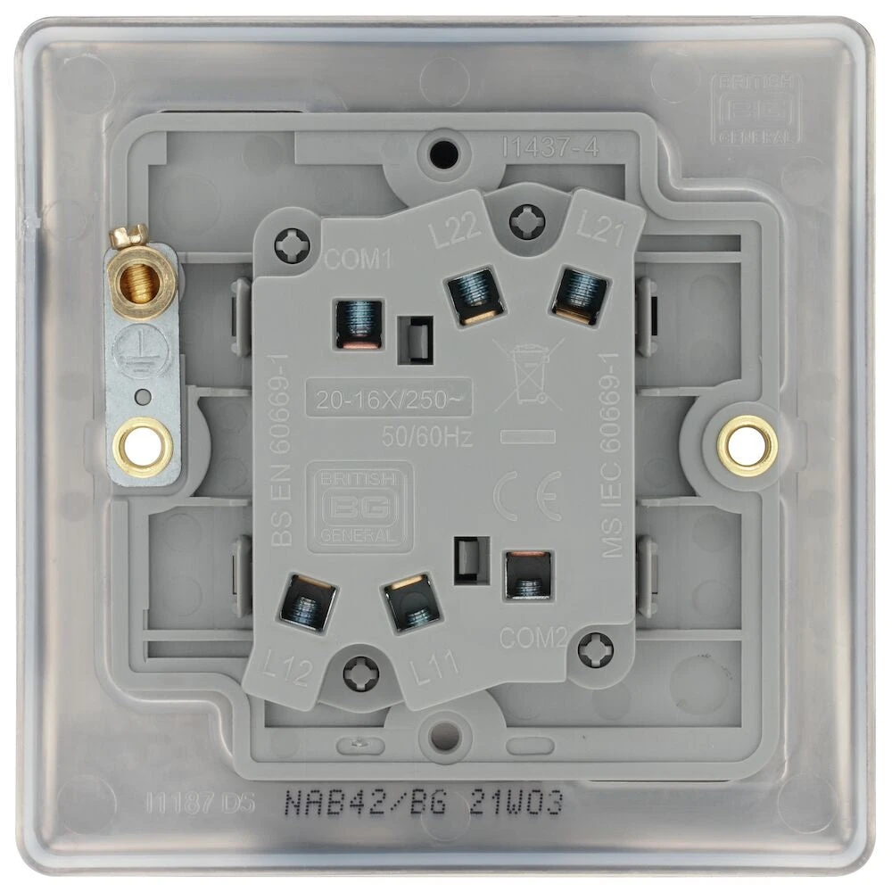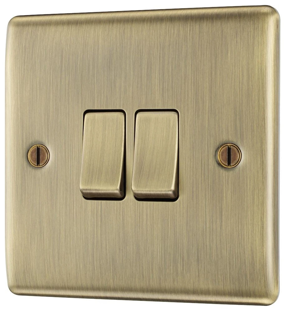 The NAB2WINT is a 2W & intermediate light switch from the BG Nexus Metal range, finished in antique brass and built using BG Nexus Grid system. This range of switches and sockets has been designed with a modern, slim profile and has a lightly lacquered surface to reduce fingerprint marks.