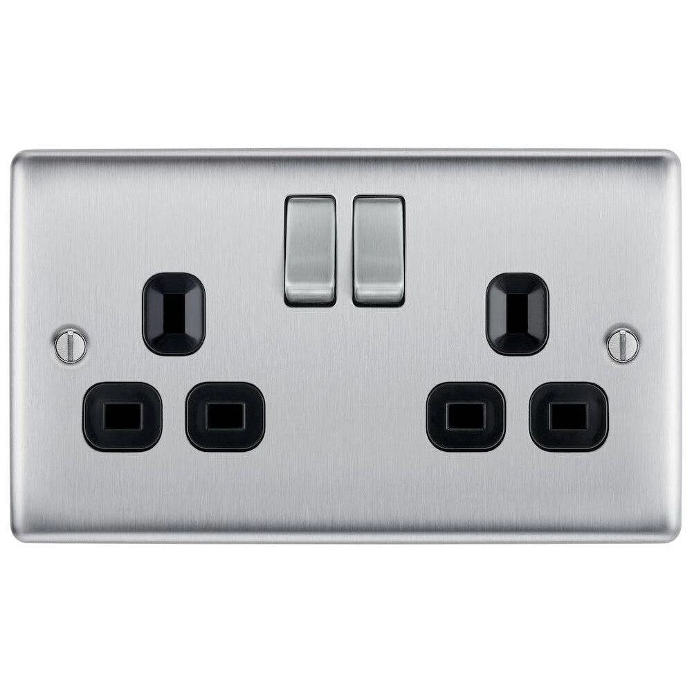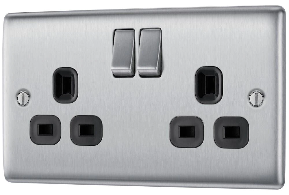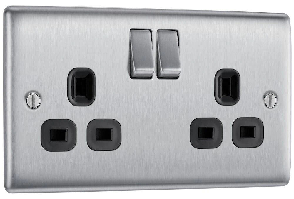 The NBS22B is a 13A double socket from the BG Nexus Metal range, finished in brushed steel with black inserts. This range of switches and sockets has been designed with a modern, slim profile and has a lightly lacquered surface to reduce fingerprint marks. The BG Nexus Metal range of switches and sockets comes with colour coded screws and has a full grid system to match.