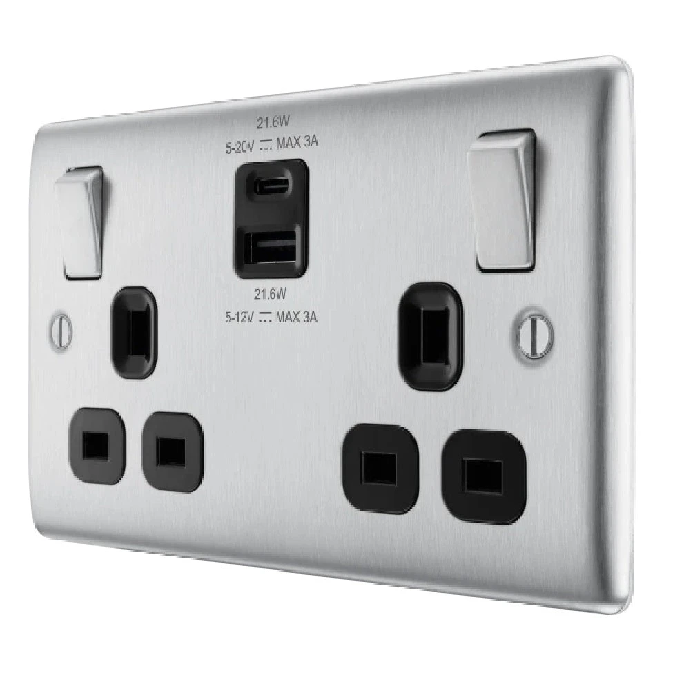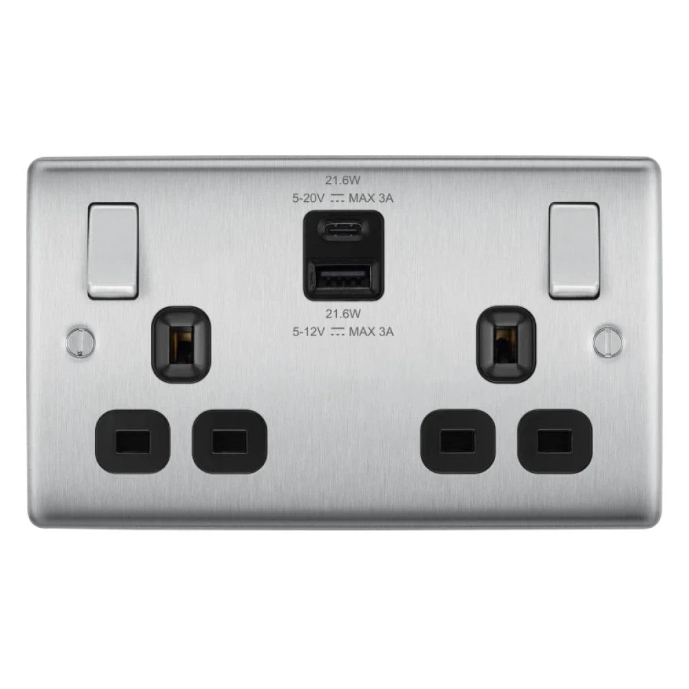 BG Nexus Metal Brushed Steel 13A Double USB Socket With 22W A+C Ports NBS22UAC22B