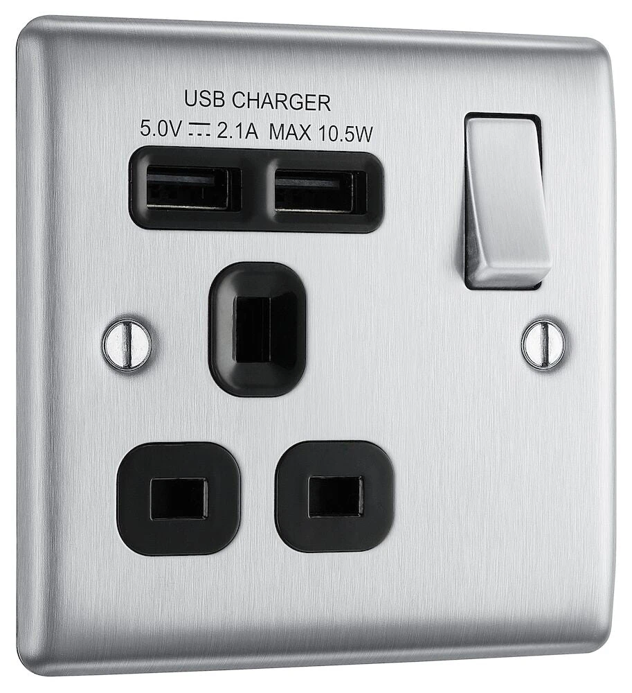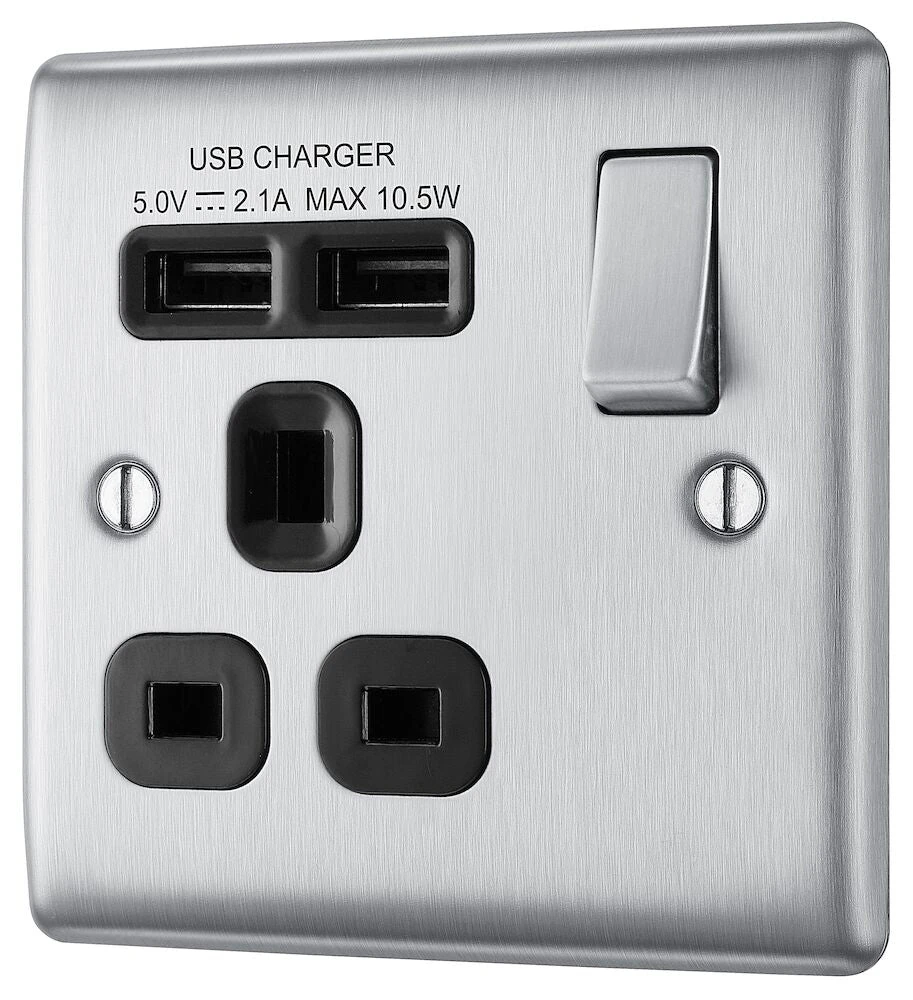 The NBS21U2B is a 13A single USB socket from the BG Nexus Metal range, finished in brushed steel with black inserts. This range of switches and sockets has been designed with a modern, slim profile and has a lightly lacquered surface to reduce fingerprint marks. The BG Nexus Metal range of switches and sockets comes with colour coded screws and has a full grid system to match.