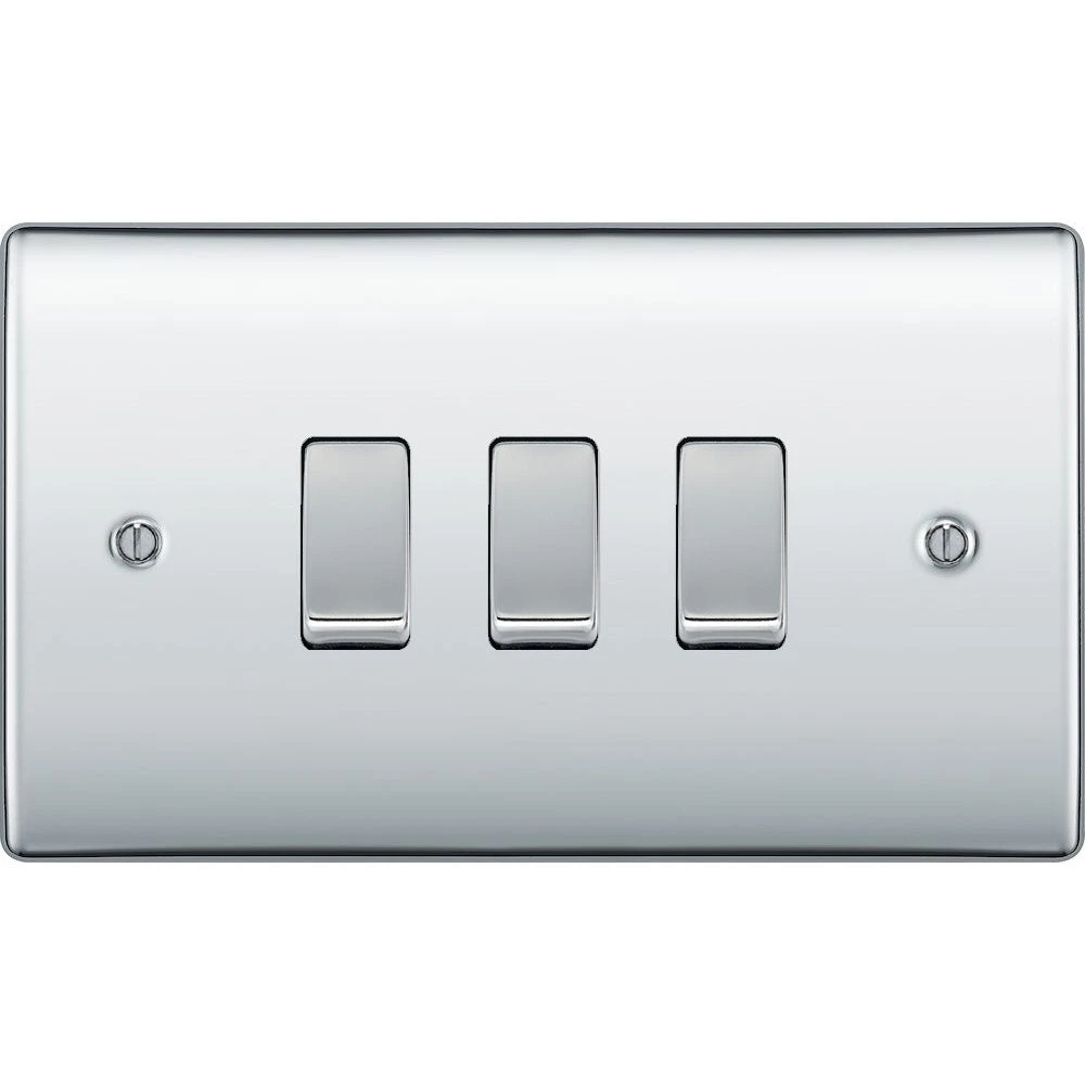 The 3G intermediate combination switch from the BG Nexus Metal range, finished in polished chrome. This range of switches and sockets has been designed with a modern, slim profile and has a lightly lacquered surface to reduce fingerprint marks. BG Nexus Metal switches and sockets come with colour coded screws and has a full grid system to match.
