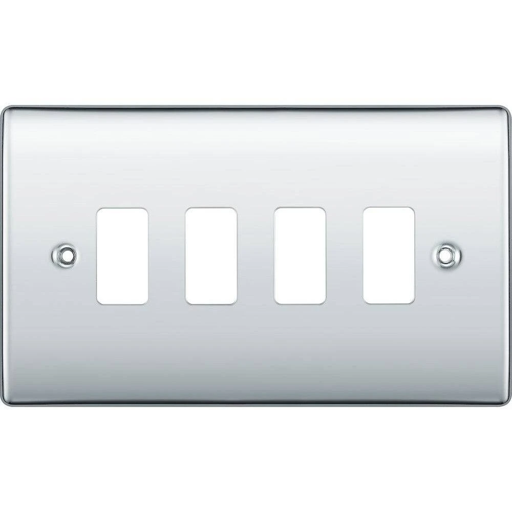 The RNPC4 is a 4G grid plate from the BG Nexus Metal range, finished in polished chrome. This range of switches and sockets has been designed with a modern, slim profile and has a lightly lacquered surface to reduce fingerprint marks.