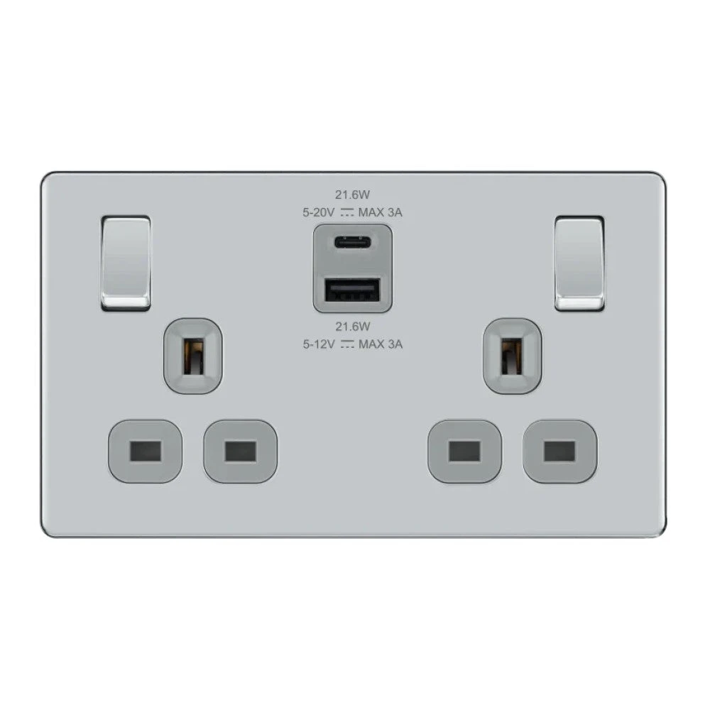 BG Nexus Screwless Polished Chrome 13A Double USB Socket 22W A+C Ports FPC22UAC22G