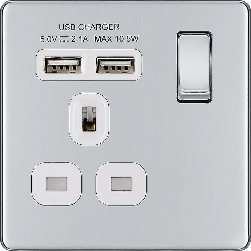 The FPC21U2W is a 13A single USB socket from the BG Nexus Screwless range, finished in polished chrome with white inserts. With no visible screws on the decorative front plate, the collection also has a low profile, projecting 3mm from the wall. This range also comes with a full grid system to match.