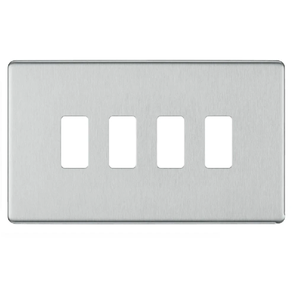 The RFBS4 is a 4G grid plate from the BG Nexus Screwless Flat Plate range, finished in brushed steel. The Grid range has been created to give you the flexibility to create bespoke combinations of switches.