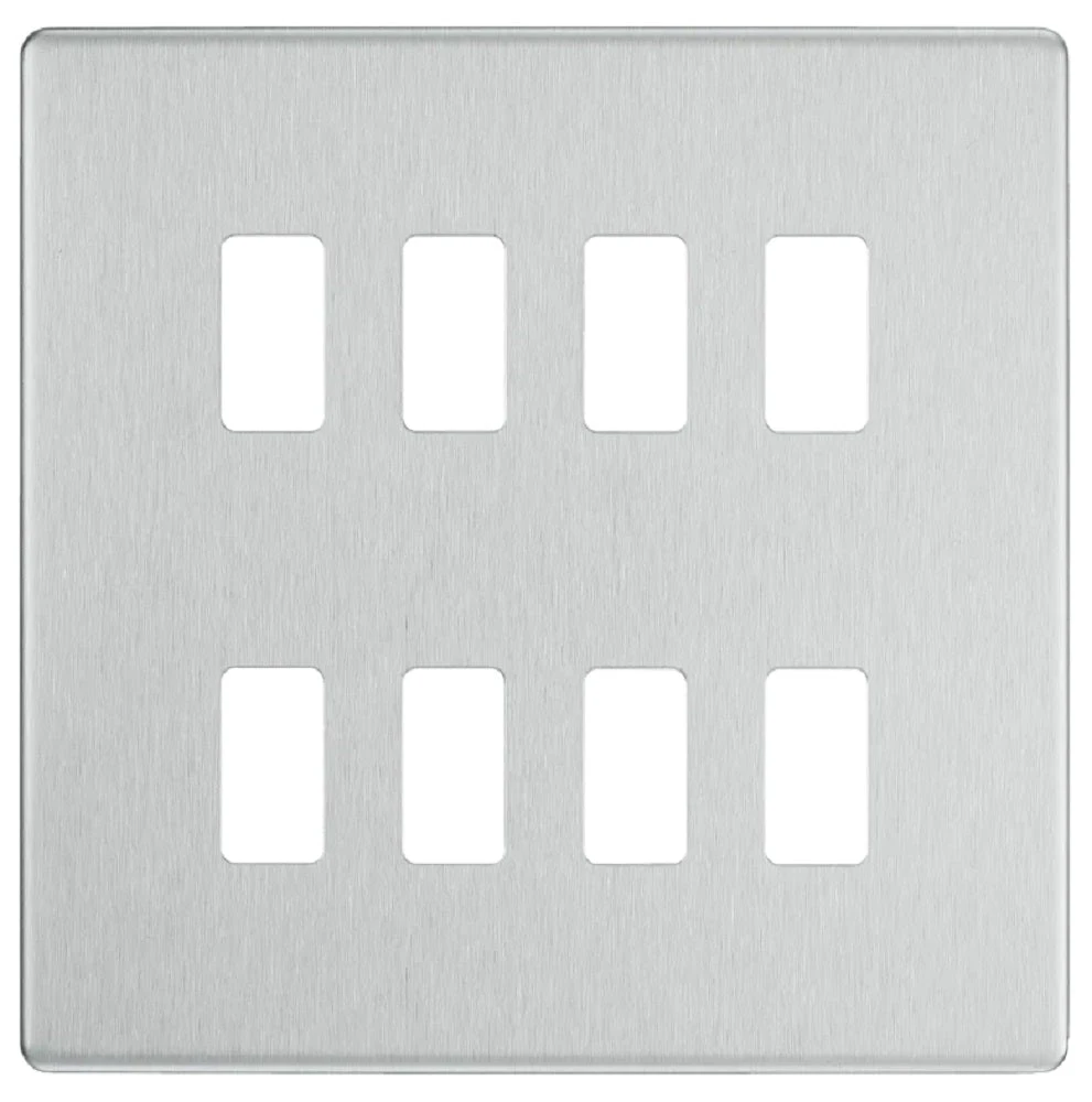 The RFBS8 is a 8G grid plate from the BG Nexus Screwless Flat Plate range, finished in brushed steel. The Grid range has been created to give you the flexibility to create bespoke combinations of switches.