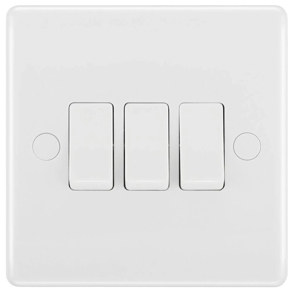 The 843 is a 3G 2W light switch from the BG White Moulded range. White PVC switches and sockets are essential to any rewire or new build but this range from BG sets its self apart from the standard. With a rounded, convex plate and covers for the screws, this white PVC range has a clean, modern look.