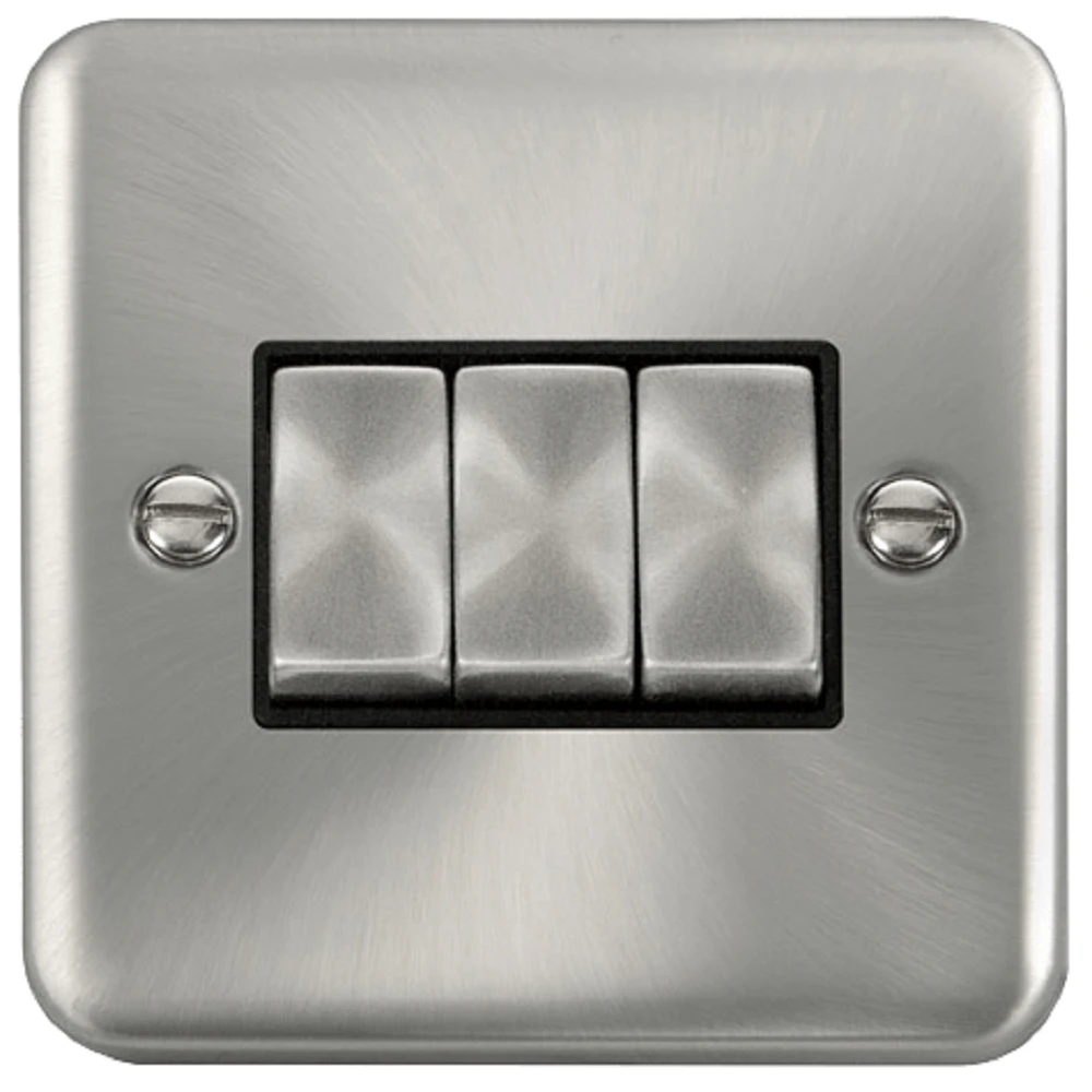 The DPSC413BK is a 3G light switch from the Click Deco Plus range by Scolmore, finished in satin chrome. Expertly crafted from durable stainless steel, the Click Deco Plus line boasts a unique raised design and smooth, rounded edges. Scolmore’s reputation for top-of-the-line, premium products is upheld with this fully comprehensive range.