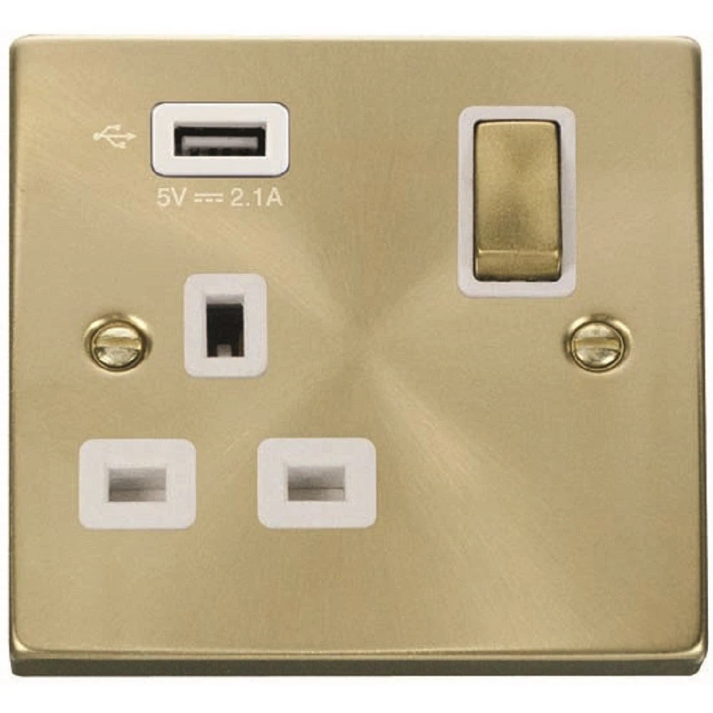 The VPSB571UWH is a 13A Single USB Socket from the Click Deco range by Scolmore, finished in satin brass with a white insert. The Click Deco range has a distinctive raised plate, squared edge design and is constructed from premium stainless steel for a long-lasting finish.