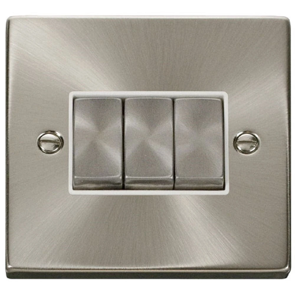 The VPSC413WH is a 3G Light Switch from the Click Deco range by Scolmore, finished in Satin Chrome. The Click Deco range has a distinctive raised plate, squared edge finish and is constructed with premium stainless steel for a long-lasting finish.