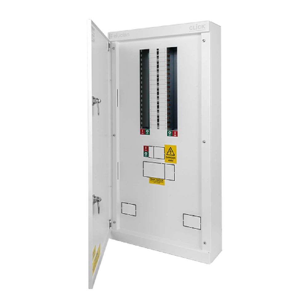 Upgrade your distribution system with the Elucian 3 Phase Distribution Board. Designed for 125A or 250A installations, this 12 way, 3 phase board features a top & bottom gland plate. The quick release door and left/right opening make for easy access. Expandable with an expansion box and compatible with surge protection and energy monitoring for enhanced performance and safety.